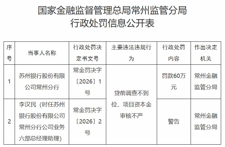 【大河财立方消息】4月10日股票配资知识官网,国家金融监督管理总局常州监管分局披露的行政处罚信息公开表显示,因贷前调查不到位、项目资本金审核不严,苏州银行股份有限公司常州分行被罚60万元。